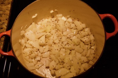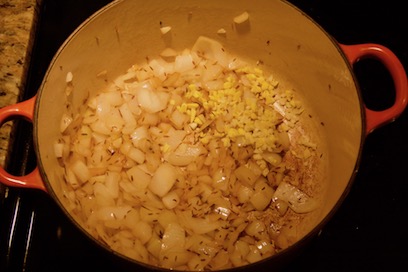 Heat ghee over medium in a cast iron dutch oven. Once hot, add onion and cumin seeds and cook until browned.