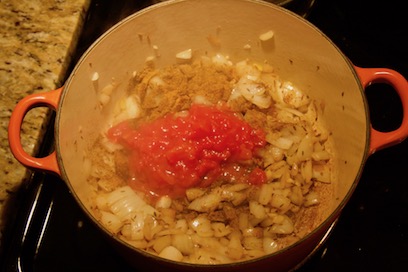 Add tomatoes and remaining spices. Cook for 3-5 minutes and scrape up any browned bits stuck to the bottom of the pan.