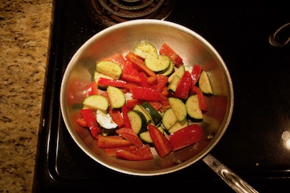 Heat olive oil on medium-high heat in a stainless steel skillet. Add zucchini and bell pepper. Season with salt and pepper. Sauté until browned.
